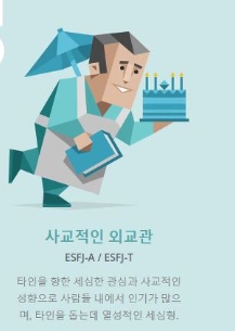 ESFJ (집정관) - 배려심이 넘치고 언제나 다른 사람을 도울 준비가 되어 있는 특징으로, 인기가 많고 붙임성 높은 마당발이고요.