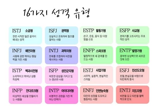 mbti는 알파벳 4가지를 동원하여 사람의 성격 유형을 포착하고 4가지 선호 성향에 따라 16가지의 성격유형으로 나뉘고 각 성격유형마다 상이한 특성을 지참하고 있어요.