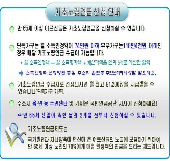 - 만 65세 이상 한국 국적을 지참하고 계시면서 국내에 지내는 어르신 중 가구 소득액이 선정기준액 이하에 차지하는 분 (만 65세 생일에 속하는 달 1개월 전부터 신청이 가능합니다)