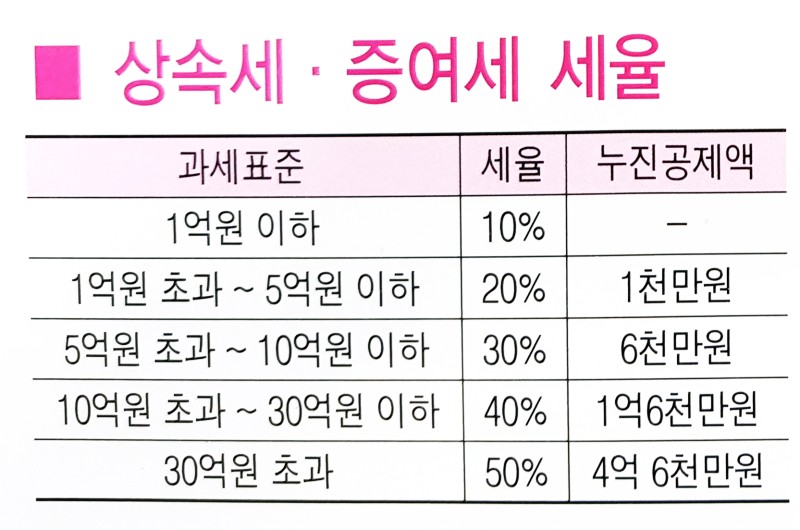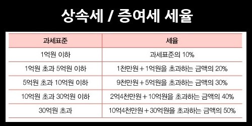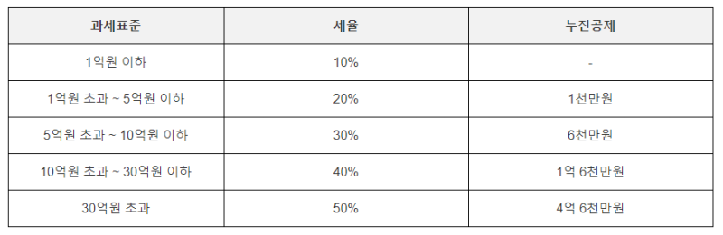 4억에 대하여 세율을 도입하면 약 7천만 원 정도 나옵니다. 그러한데 증여세라는 것이 공제도 10년에 한 번 공제를 받지만 증여세 도량도 증여한 점은 10년 내에 있다 하면 합산해서 계량합니다. 증여세는 누진세율 적용합니다. 증여 비용이 크면 클수록 더 높은 세율이 적용됨으로써 10년 건은 합해서 계측을 하고요. 상속 증여세 같은 경우에 30억이 넘으면 과세표준이 30억이 넘으면 50% 세율이예요. 30억 초과되는 가격에 대하여는 반을 세금으로 내야 해요.