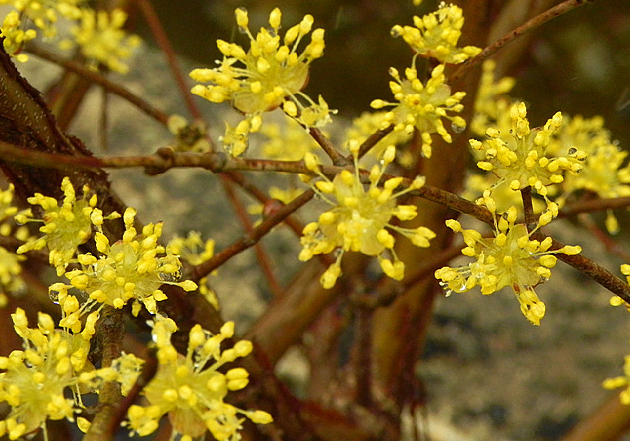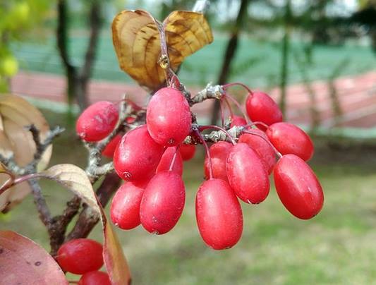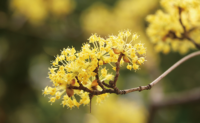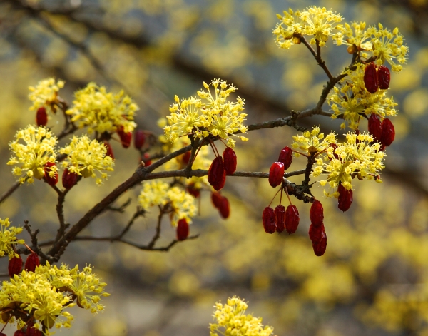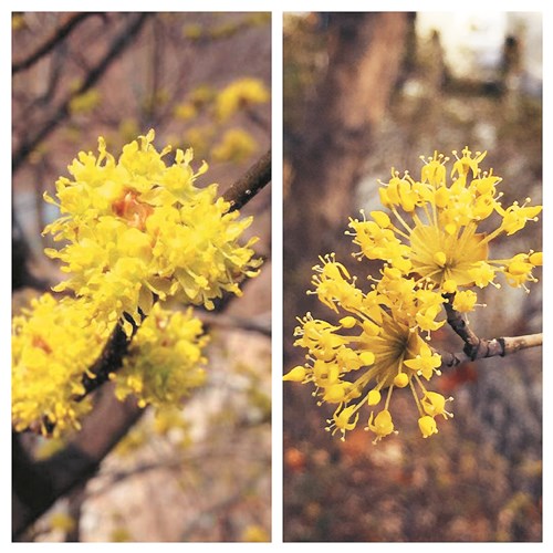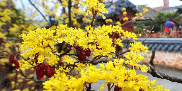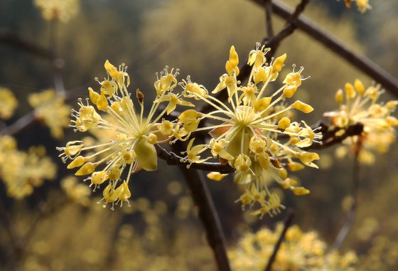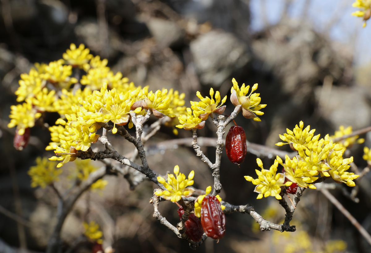 산수유는 3월 중순쯤에 노란 꽃을 피운 후 열매는 타원형으로 여름과 가을 사이에 녹색으로 열렸다가 붉은색으로 점차 익어 갑니다. 산수유를 먹을 때 과육과 씨를 따로 이용한고있다고 하며, 주로 각가지 약재와 차로 섭취할 수 있어요.
