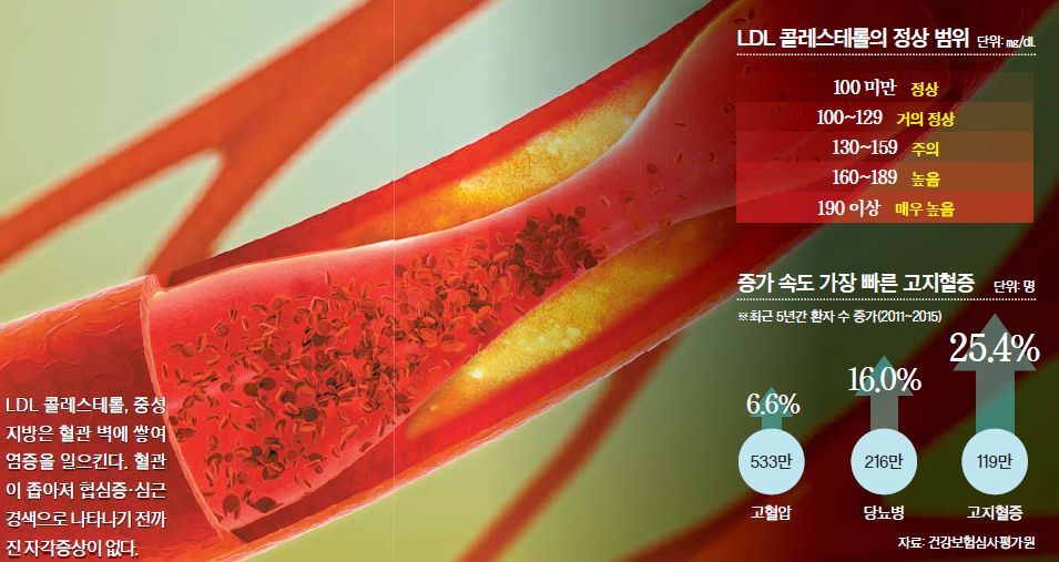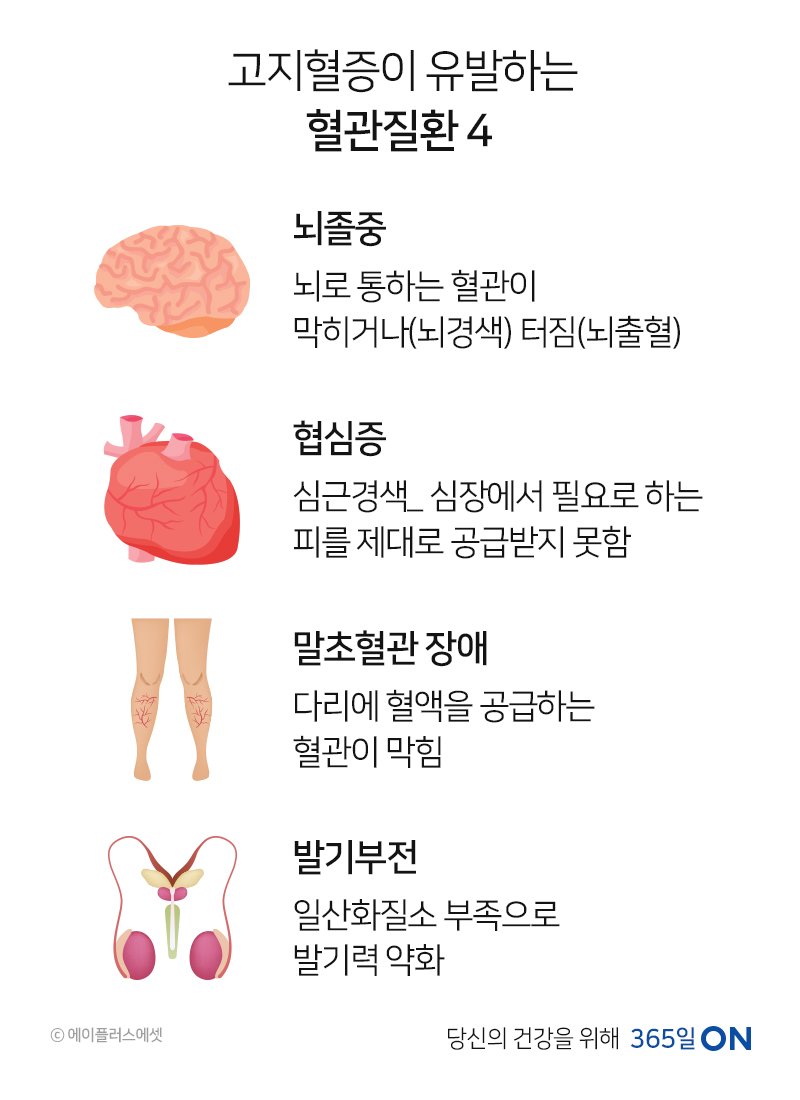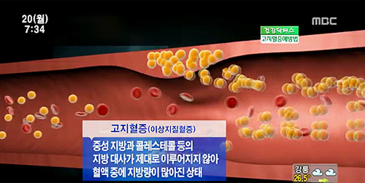 고지혈증은 혈액 속에 지질의 한 종류인 콜레스테롤이나 중성지방의 양이 정상수치보다 많은 상태를 말합니다. 다량의 지질히 혈액 속에 있을 때 그 지방이 동맥 벽에 침착되어 혈관이 좁아지고 그렇기에 심장과 뇌의 혈관 질환의 발생이 높아집니다. 고지혈증은 따로 증상이 형성되지 않고 각종 합병증이 야기될 수 있으니까 고지혈증은 잘 관리를 해야 해요.